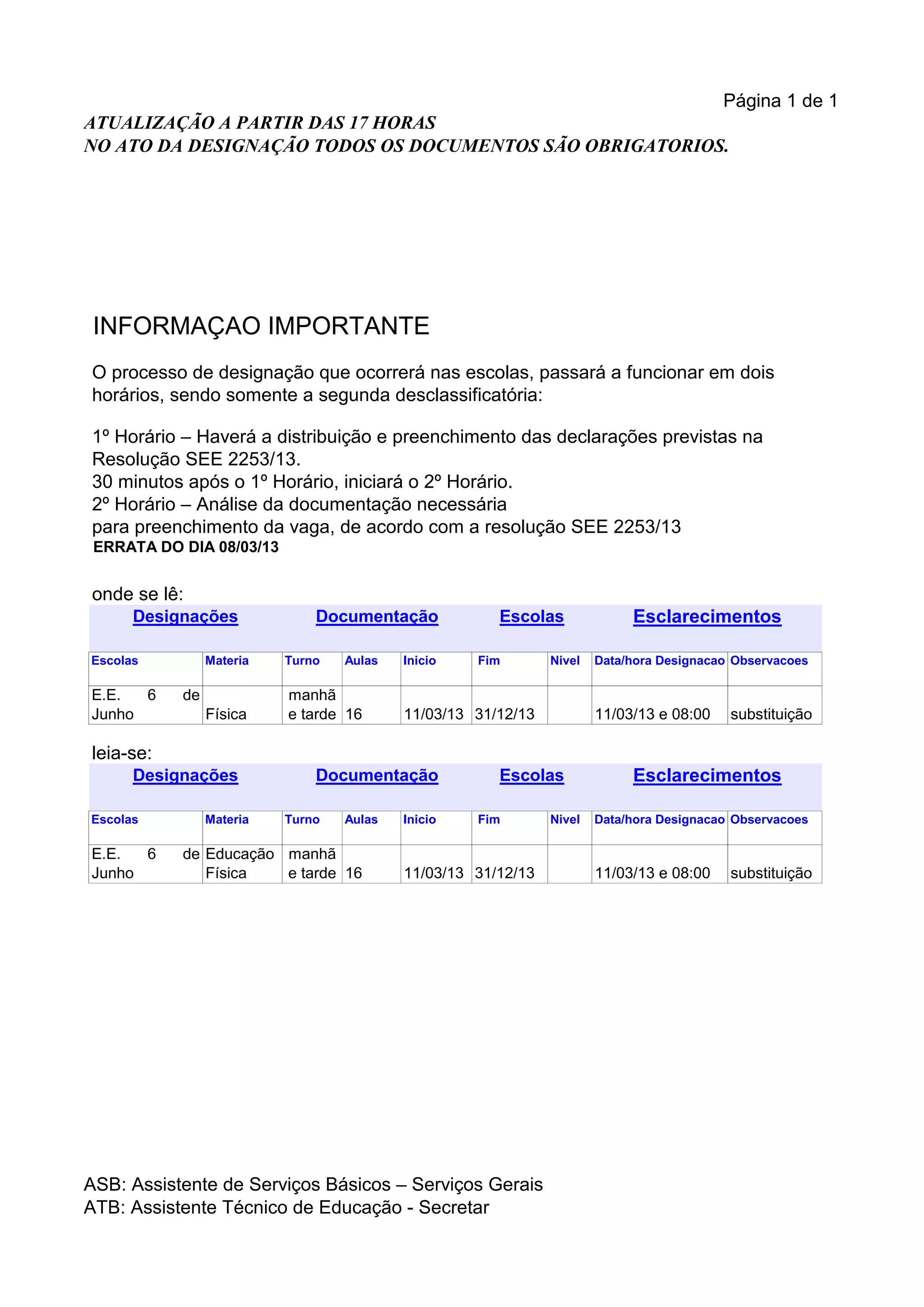 O documento descreve as informações sobre o processo de designação de professores nas escolas. O processo ocorrerá em dois horários, sendo que no primeiro horário os professores preencherão declarações obrigatórias e no segundo horário serão analisados os documentos necessários para preenchimento das vagas de acordo com a resolução SEE 2253/13. O texto também corrige um erro em uma tabela e lista os cargos de Assistente de Serviços Básicos e Assistente Técnico de Educação.
