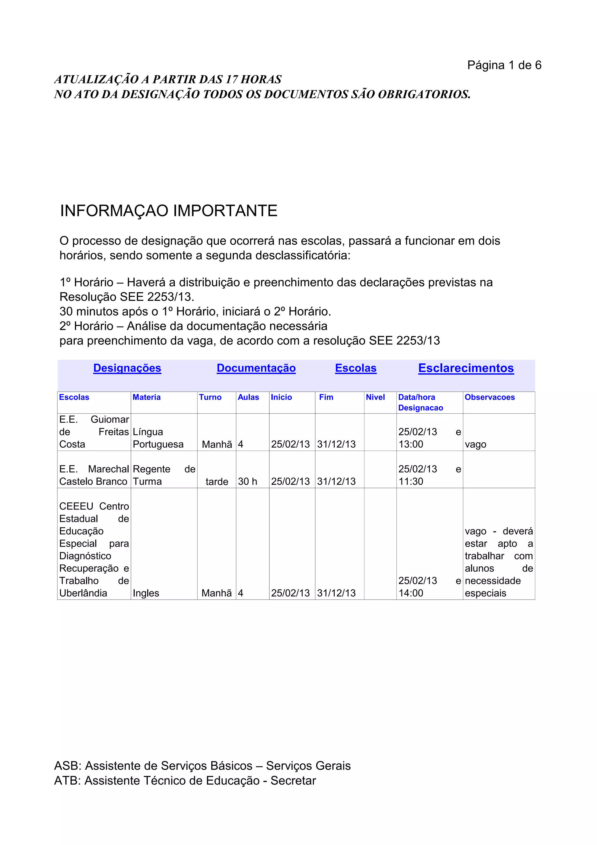O documento lista vagas de emprego em escolas para professores e funcionários. Ele detalha as matérias, turnos, datas e requisitos para cada vaga. Todas as designações ocorrerão em 25 de fevereiro de 2013 e exigem a apresentação de documentação completa.