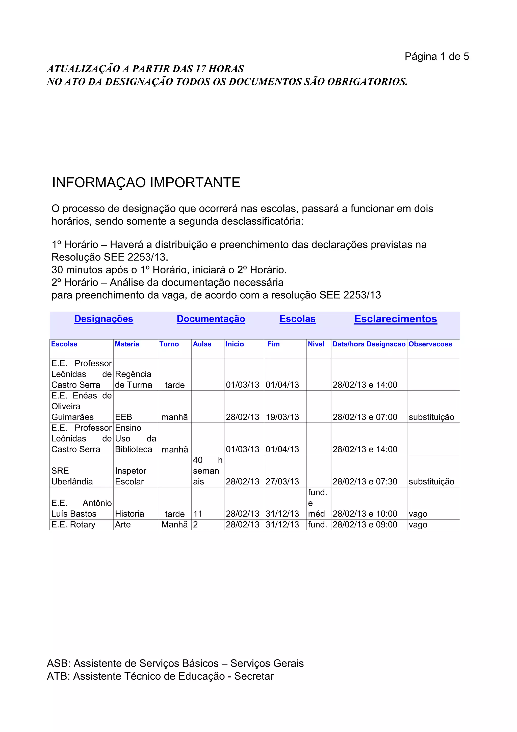 O documento lista várias vagas de emprego em escolas, incluindo matérias, turnos, datas e observações. Ele também fornece informações sobre o processo de designação, que agora terá dois horários, sendo o segundo para análise de documentação.
