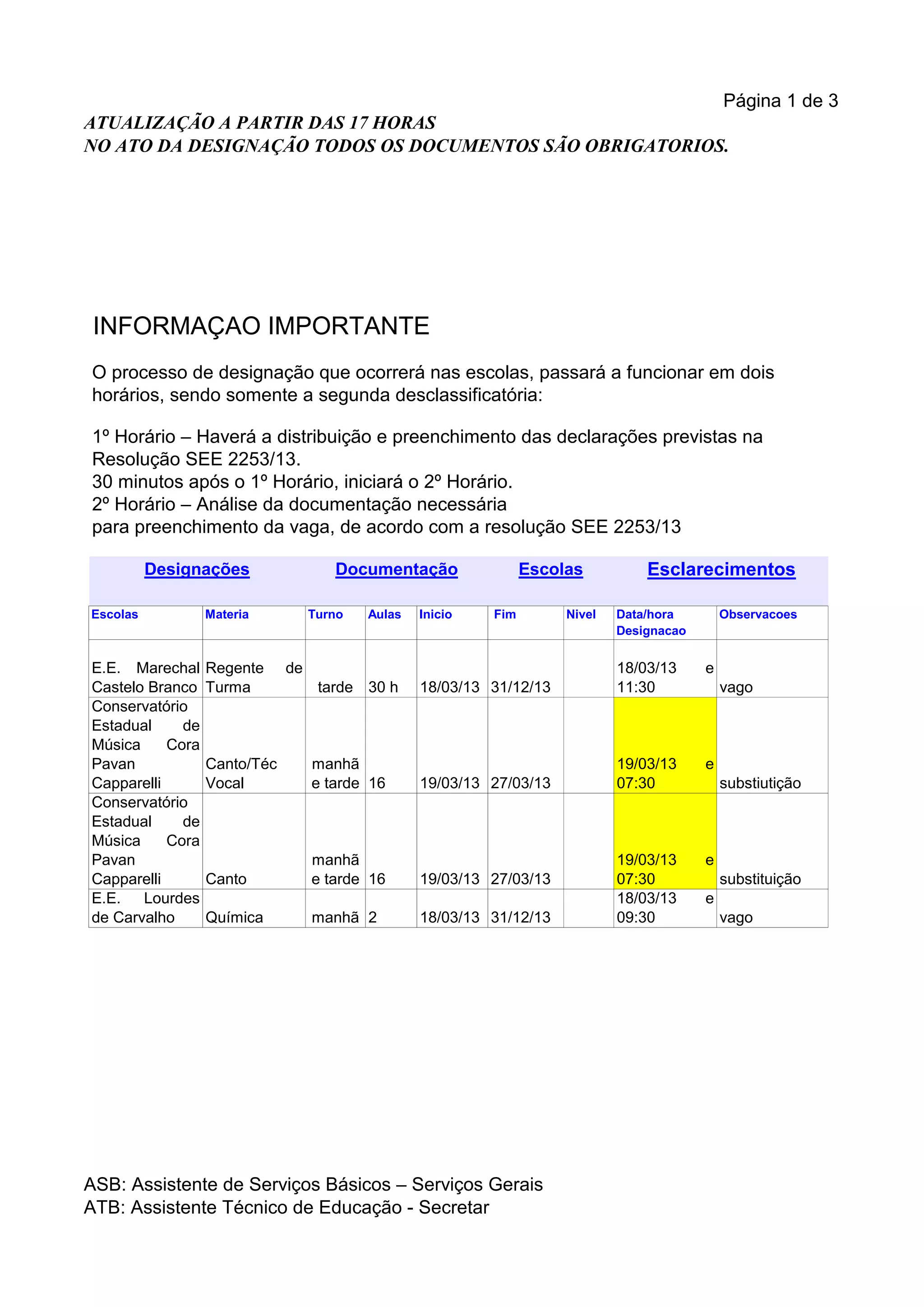 O documento lista vagas de emprego em escolas, incluindo matérias, turnos, carga horária e datas. Detalha o processo de designação com dois horários, um para preenchimento de declarações e um segundo para análise de documentação.