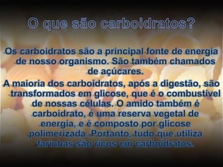 O documento discute carboidratos, suas funções e classificações. Carboidratos são a principal fonte de energia e incluem açúcares simples, como glicose e frutose, e complexos como amido e celulose. Eles podem ser classificados em monossacarídeos, dissacarídeos e polissacarídeos.