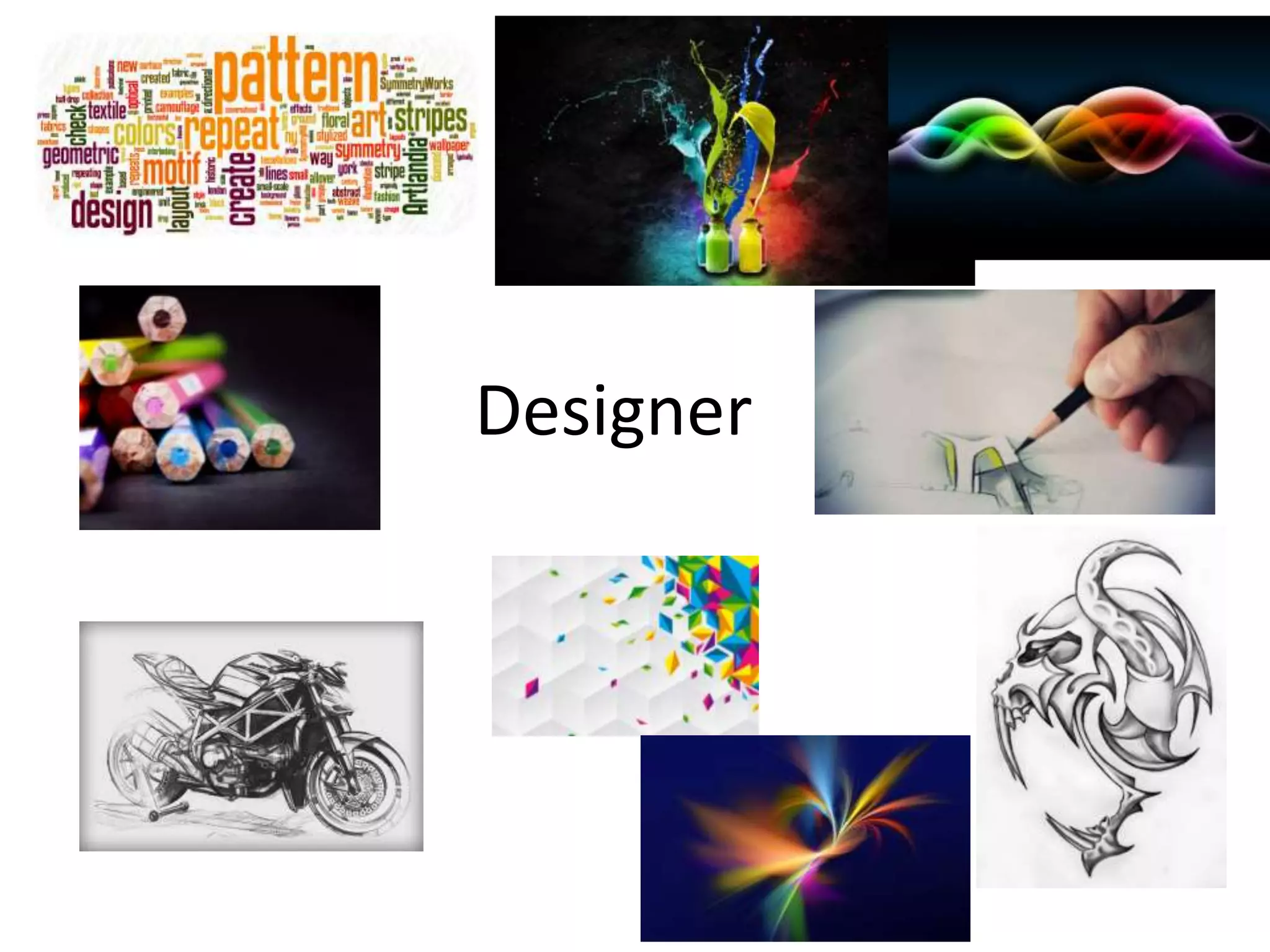 O documento descreve o que é design e designer. Um designer idealiza, cria e desenvolve objetos industriais levando em conta padronização e produção em série. O designer busca criar objetos funcionais e esteticamente agradáveis. O processo de design envolve várias etapas como planejamento, conceito e engenharia do produto. Técnicas como estudos de viabilidade e solução criativa de problemas são usadas no desenvolvimento do produto.