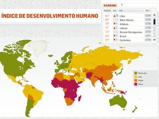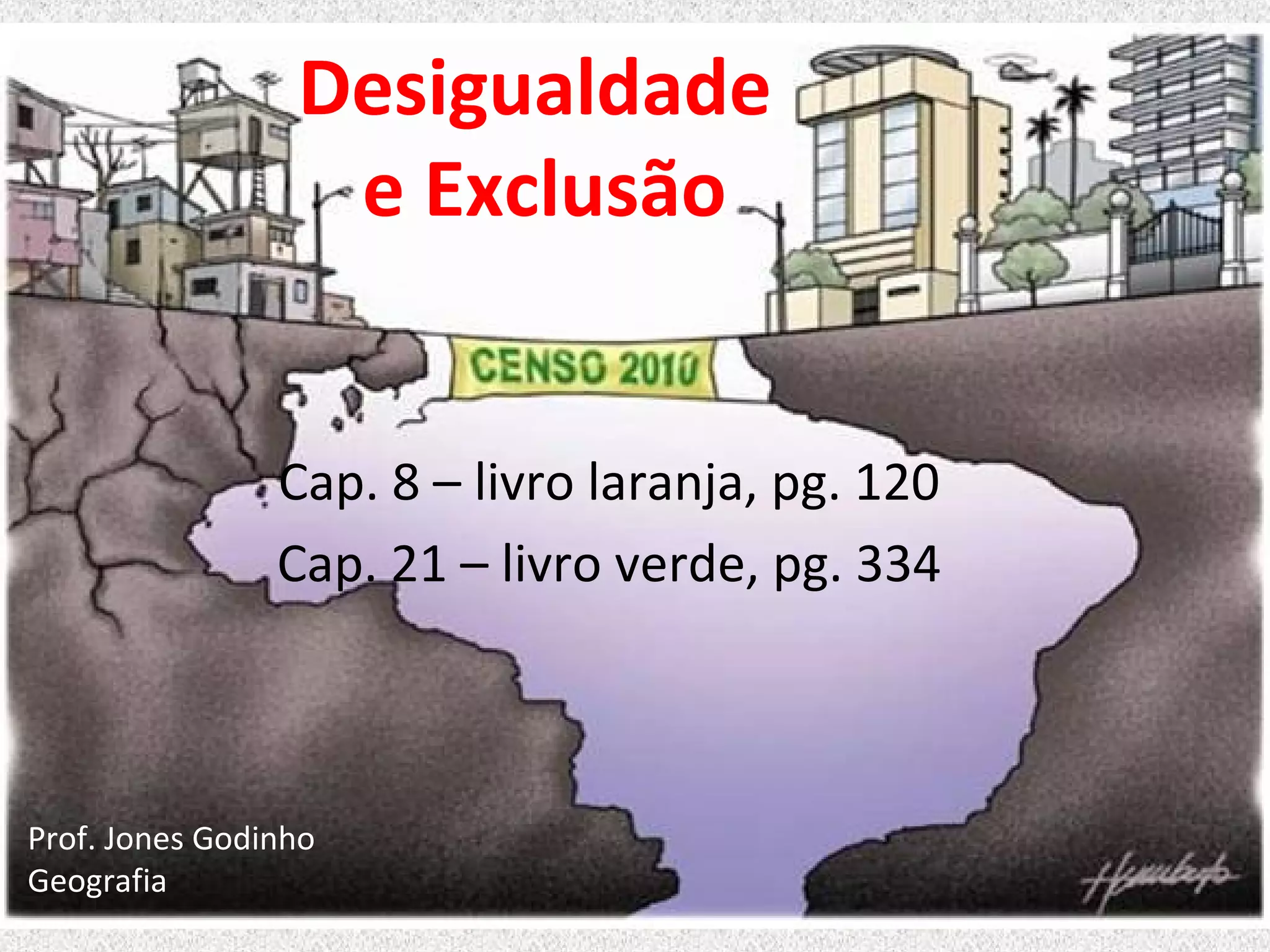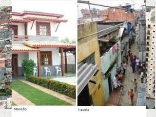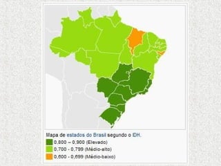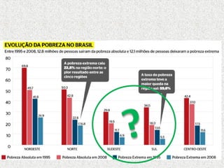 O documento discute a desigualdade e exclusão social no Brasil. Apresenta estatísticas sobre a pobreza absoluta no país, com cerca de 10 milhões de pessoas vivendo com menos de 1 dólar por dia. Discutem-se também as diferenças regionais, com o Nordeste tendo economia mais dependente do setor terciário e mão de obra barata, enquanto Sudeste e Sul tiveram industrialização e urbanização mais precoces. Finalmente, aborda-se o Índice de Desenvolvimento Humano e como ele revela as