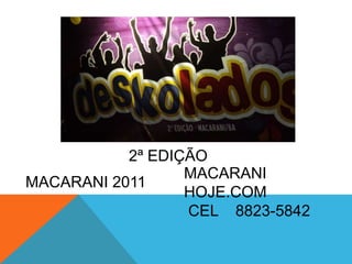Este documento fornece informações de contato para Macarani, uma empresa que vende produtos deskolados. Ele lista o nome da empresa, o ano de 2011 e um número de celular para contato.