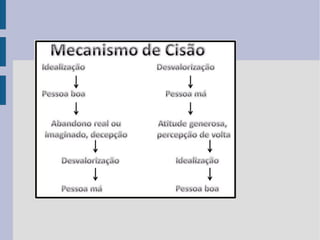 1) O documento discute o Transtorno de Personalidade Borderline, incluindo sintomas como desregulação emocional, cisão e relações instáveis.