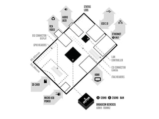 [1] O documento discute a história e aplicações do Raspberry Pi, um computador de baixo custo usado para ensinar programação. [2] É explicado que o Raspberry Pi contém um processador de 700MHz, 512MB de RAM, saídas HDMI/VGA e portas GPIO para conectar hardware. [3] As portas GPIO permitem a programação embarcada controlando dispositivos eletrônicos.