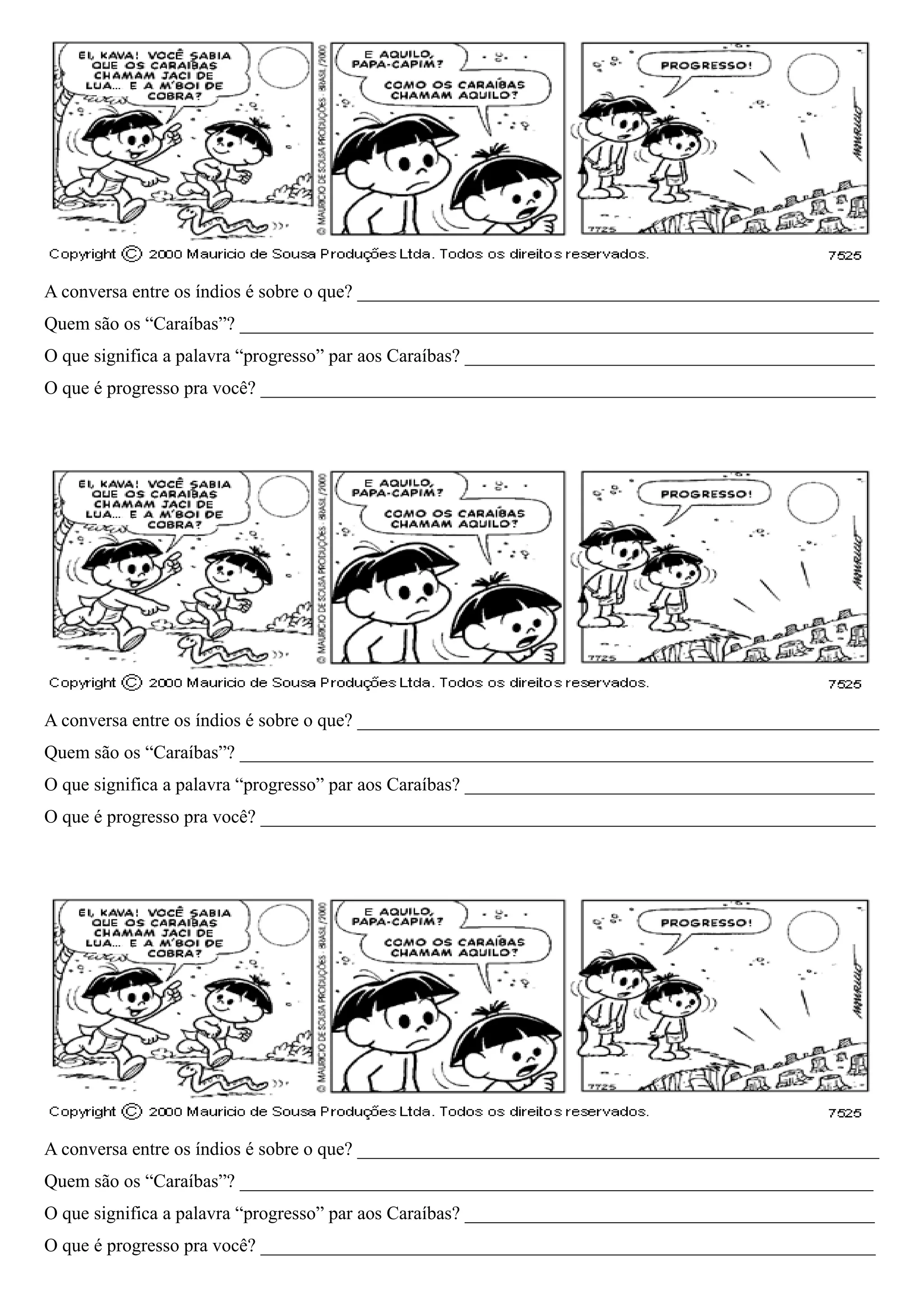 O documento discute a perspectiva dos índios Caraíbas sobre o progresso, perguntando sobre o que os índios conversam, quem são os Caraíbas, o que progresso significa para eles e o que significa progresso para o leitor.