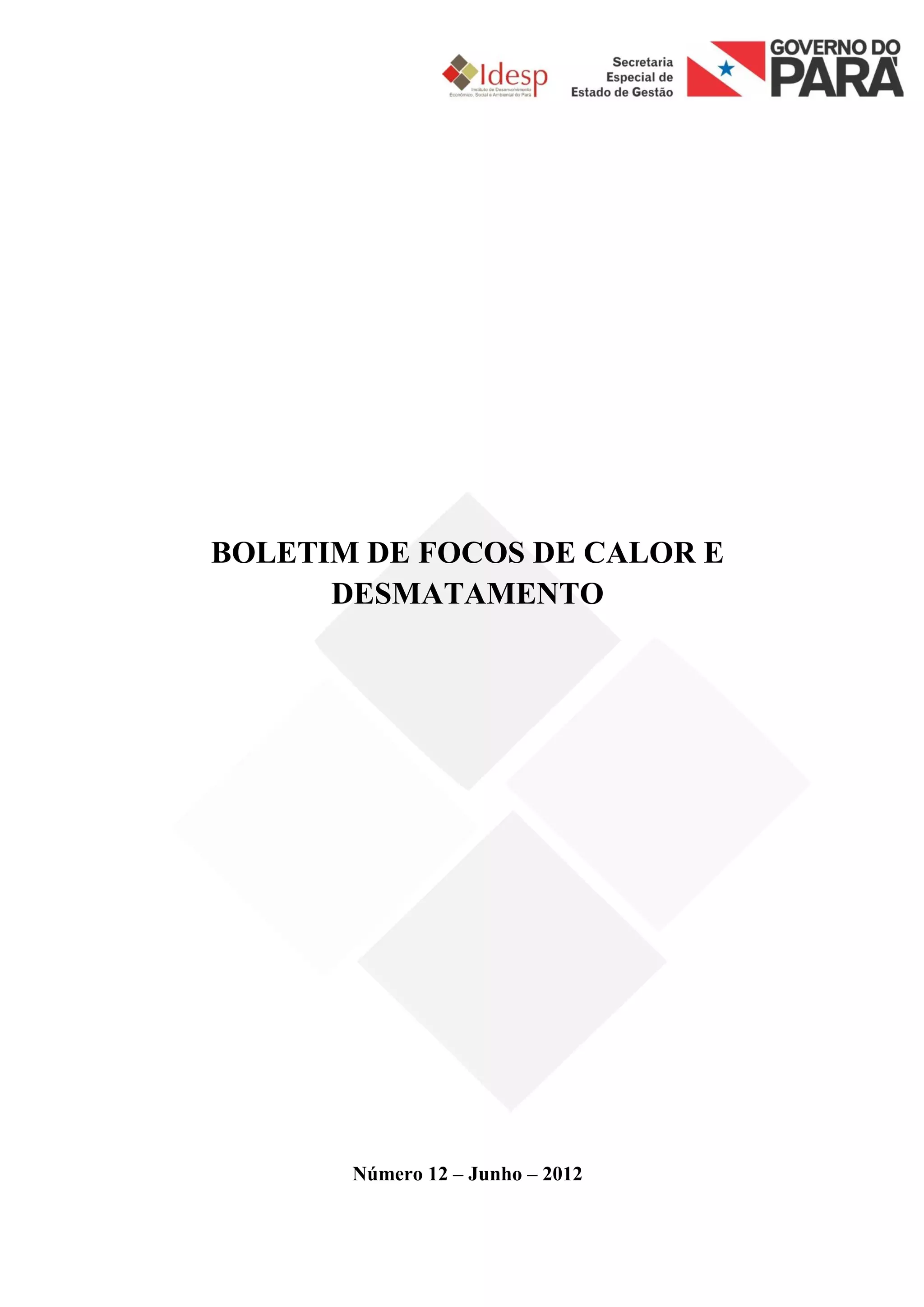 Este boletim apresenta informações sobre focos de calor e desmatamento no estado do Pará no mês de junho de 2012. O desmatamento total foi de 37,73 km2, concentrado principalmente em Altamira. Foram detectados 183 focos de calor, com maior número em Santa Maria das Barreiras, Dom Eliseu e Santana do Aragua. O documento também fornece detalhes técnicos sobre os sistemas de monitoramento de desmatamento e focos de calor utilizados.
