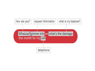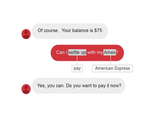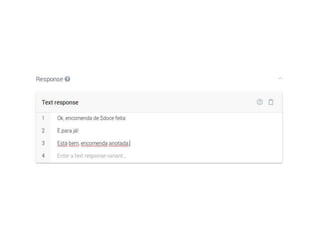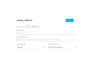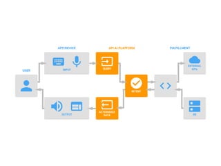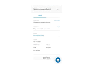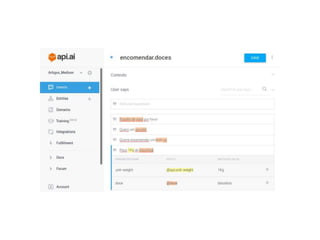 O documento discute as principais funcionalidades e conceitos por trás do Dialogflow (antigo API.AI), incluindo agentes, intenções, entidades, treinamento e integrações. O autor também fornece referências sobre processamento de linguagem natural e ferramentas de conversação.