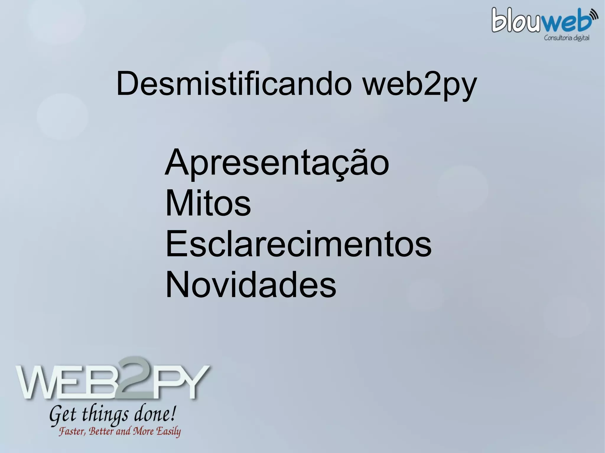 1. Apresentação sobre os mitos e esclarecimentos sobre o framework web2py 2. O framework segue os princípios pythonicos de não repetição de código e haver uma única maneira de se fazer algo 3. Apesar de alguns acharem que o framework não é pythonico por usar exec() e import implícito, ele explica porque isso torna o código mais conciso