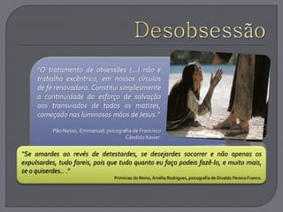 O documento discute o processo de desobsessão como uma forma de regeneração espiritual e cura de obsessões. A autodesobsessão, por meio da reforma moral e do autocontrole das paixões, é apontada como o principal meio de libertação, auxiliado pelas reuniões de desobsessão e pelo tratamento espiritual baseado no amor e na compreensão fraterna.