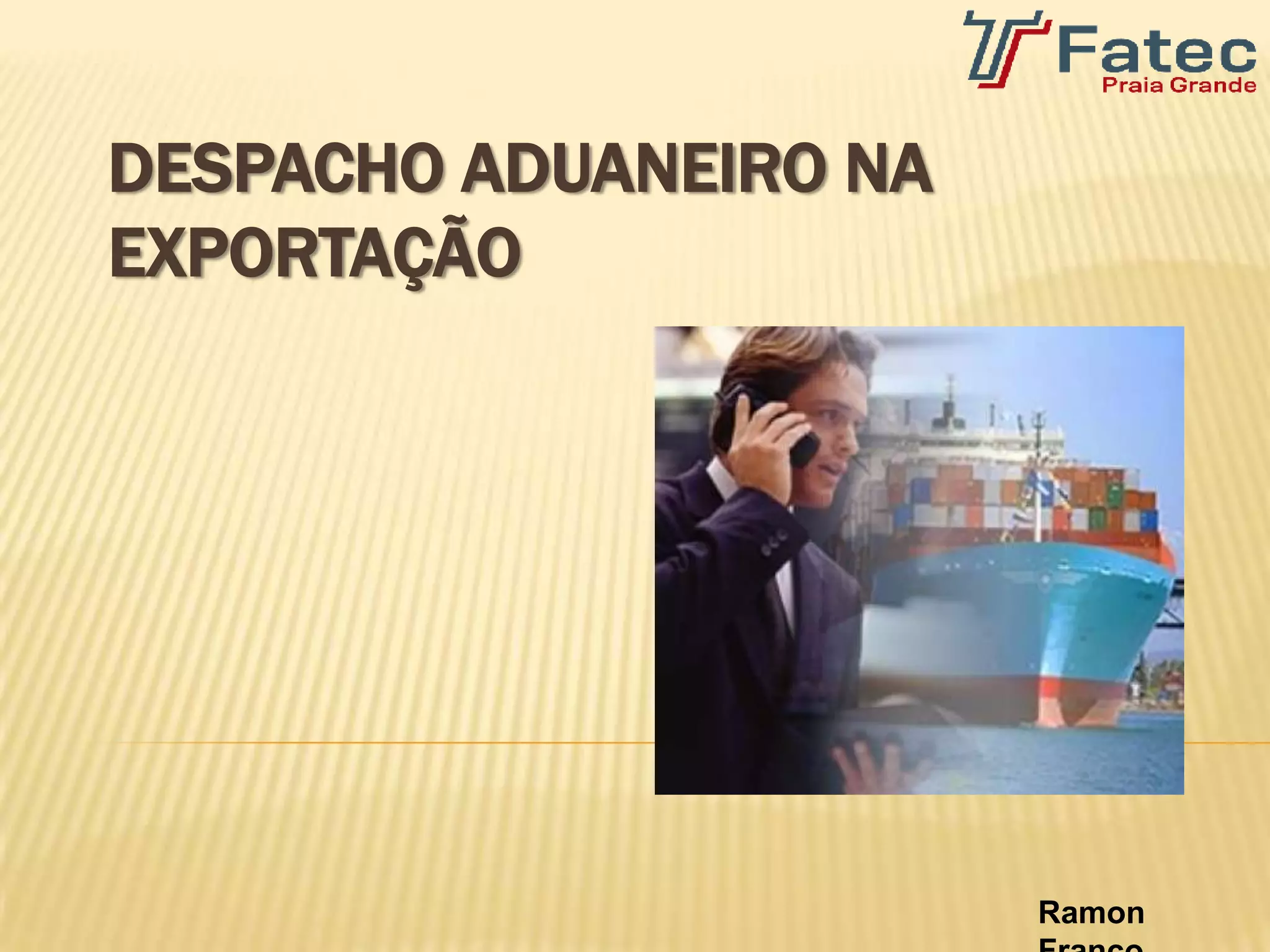 O documento descreve os 8 passos do processo de despacho aduaneiro na exportação no Brasil, que inclui o registro de documentos, a fiscalização, o desembaraço e a emissão do comprovante de exportação pela Receita Federal para que as mercadorias possam deixar o país.