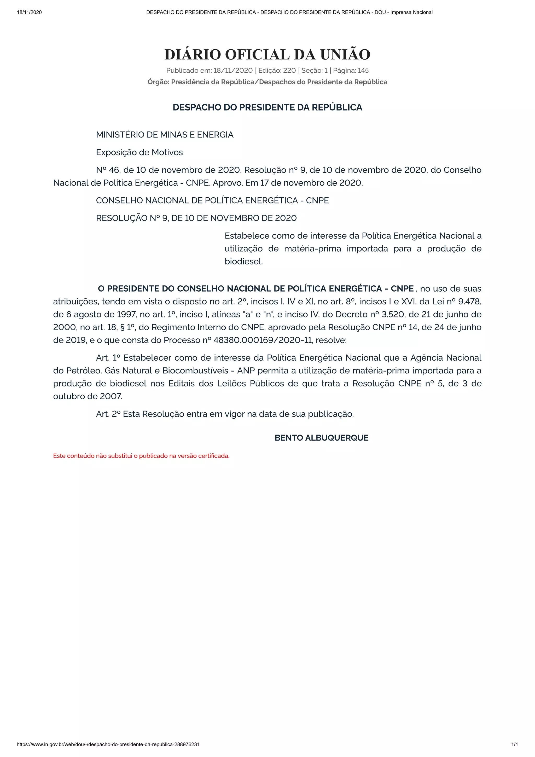 O presidente da República aprovou uma resolução do Conselho Nacional de Política Energética que estabelece como de interesse da política energética nacional a utilização de matéria-prima importada para a produção de biodiesel, permitindo que a Agência Nacional do Petróleo, Gás Natural e Biocombustíveis inclua essa possibilidade em editais de leilões públicos.