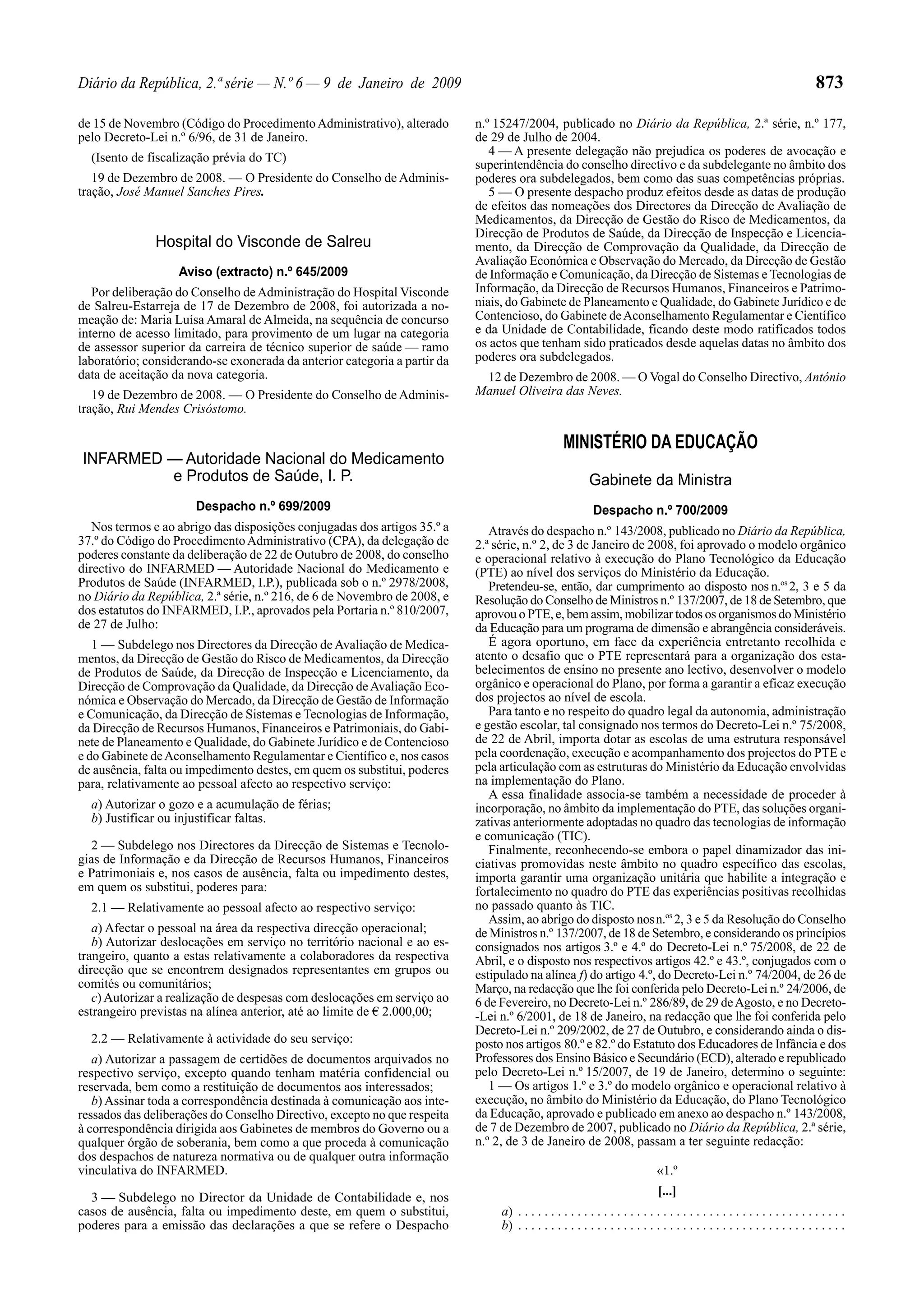Este documento contém vários avisos e despachos de diferentes instituições públicas portuguesas. O despacho 700/2009 do Ministério da Educação atualiza o modelo organizacional da implementação do Plano Tecnológico da Educação para garantir a execução eficaz dos projetos a nível das escolas.