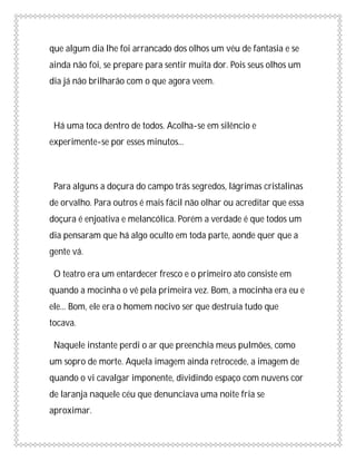A carta descreve a relação da autora com um homem misterioso e selvagem. Ela se sente profundamente atraída por ele, mas ele também a machuca. A autora reflete sobre a natureza do amor, da vida e da morte. No final, ela tem um sonho de despedida com o homem, sabendo que seu corpo frágil não durará por muito tempo.