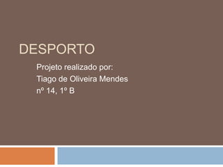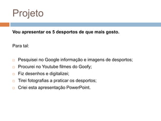 Este projeto apresenta os 5 desportos favoritos de Tiago de Oliveira Mendes. Ele pesquisou informações e imagens sobre basquetebol, futebol, ténis, atletismo e saltos de esqui no Google e Youtube, fez desenhos digitais e fotografias praticando os desportos, e criou uma apresentação do PowerPoint para compartilhar seus achados.