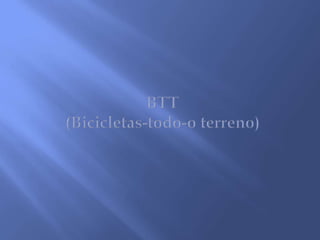 O documento descreve a origem e evolução do BTT (Bicicleta de Montanha ou Mountain Bike). O BTT surgiu na década de 1970 quando hippies na Califórnia adaptavam bicicletas antigas para subir e descer trilhas de montanha. O esporte ganhou popularidade e hoje existem corridas e campeonatos oficiais de BTT.