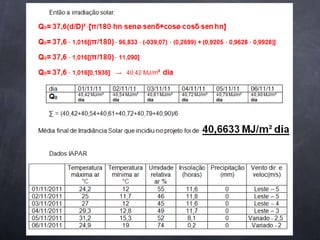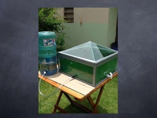 O projeto visa desenvolver um destilador solar para tratamento de água em residências. Os objetivos incluem determinar a melhor inclinação da cobertura de vidro e a melhor lâmina de água bruta para maior produção, estudar a produção em função das variações climáticas e mostrar a eficiência do sistema de potabilização.