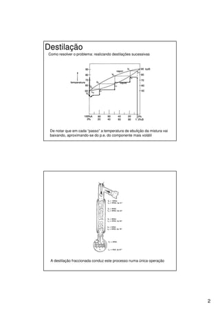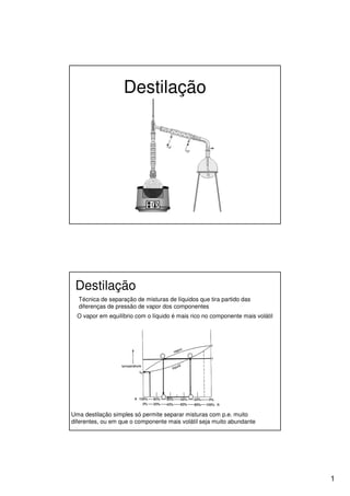 A destilação é uma técnica de separação de líquidos baseada nas diferenças de pressão de vapor dos componentes. A destilação simples é adequada para misturas com altas diferenças de ponto de ebulição, enquanto a destilação fracionada permite uma separação mais eficiente de componentes voláteis. Fatores como montagem, segurança e controle de temperatura são essenciais para o sucesso do processo.
