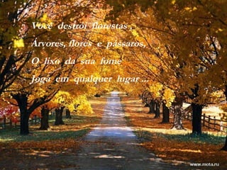 O poema critica a destruição causada pelo homem ao poluir o mundo, destruir florestas e jogar lixo sem cuidado, ameaçando transformar a Terra rapidamente. Apesar disso, o homem se vangloria do título e briga com quem contesta suas ações, sem considerar para onde essa poluição nos levará.