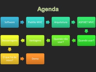 O documento descreve o framework ASP.NET MVC, incluindo suas principais características como arquitetura baseada no padrão MVC, foco em clareza, manutenibilidade e extensibilidade do código, e suporte a testes, separação de preocupações e outras boas práticas de desenvolvimento. O autor também discute mitos comuns sobre quando e por que usar ASP.NET MVC.