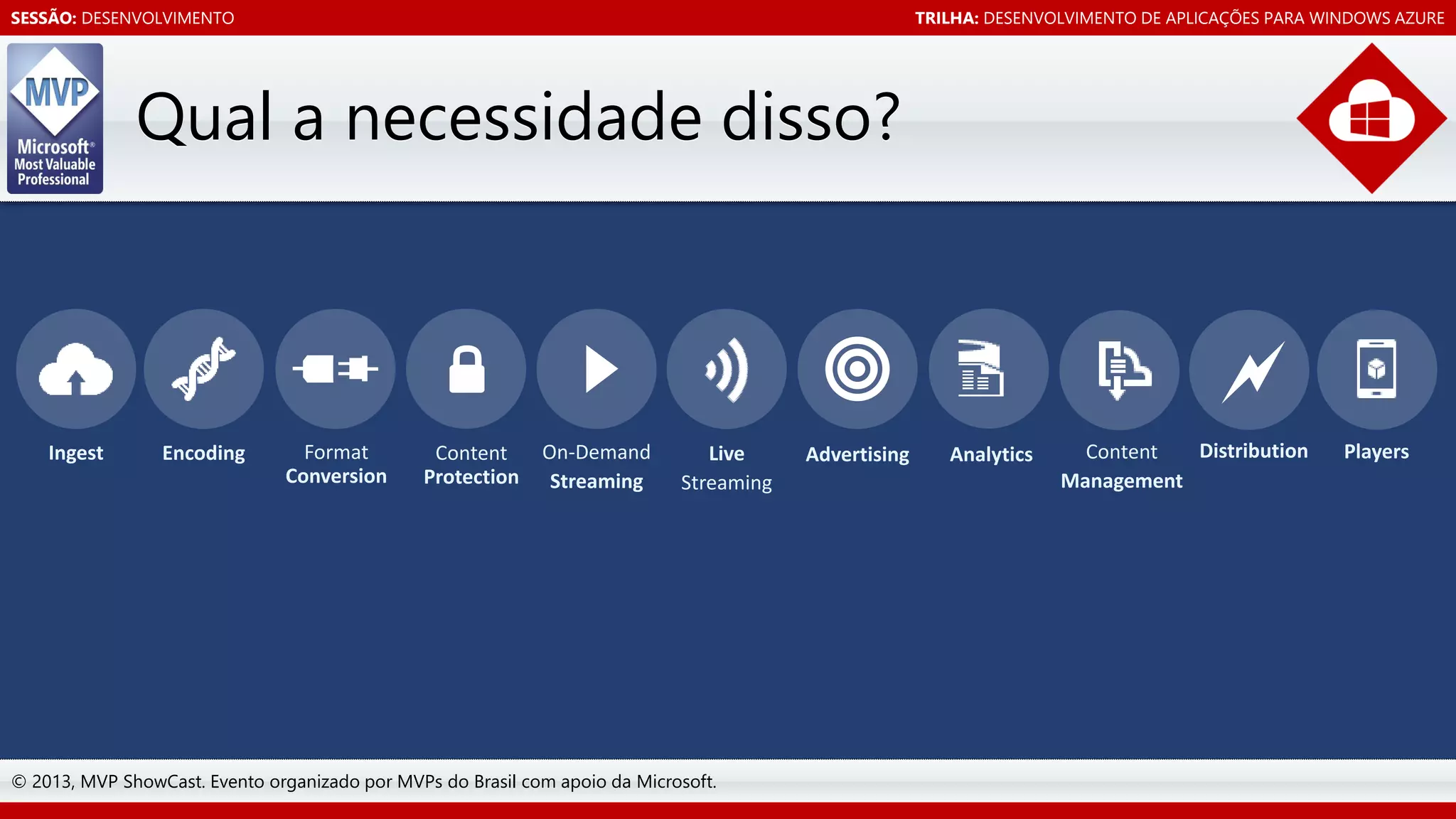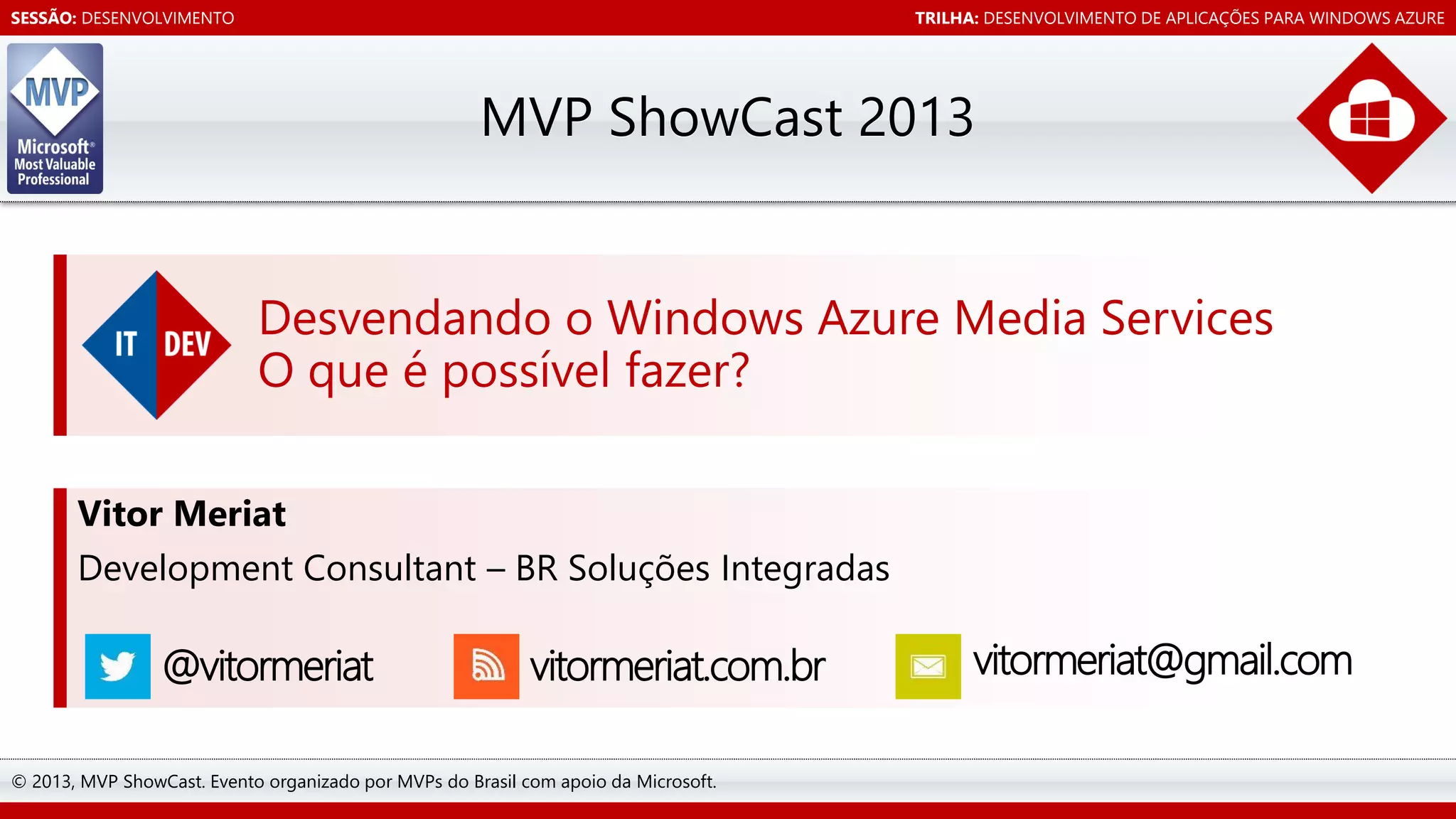 O documento apresenta o Windows Azure Media Services, que fornece serviços para ingestão, codificação, proteção, streaming ao vivo e sob demanda de conteúdo de vídeo hospedado na nuvem. O documento discute os desafios do crescimento do consumo de vídeo na internet e como o Windows Azure Media Services ajuda a resolver esses desafios através de uma plataforma gerenciada de serviços de mídia. A apresentação inclui uma demonstração dos recursos do Windows Azure Media Services.
