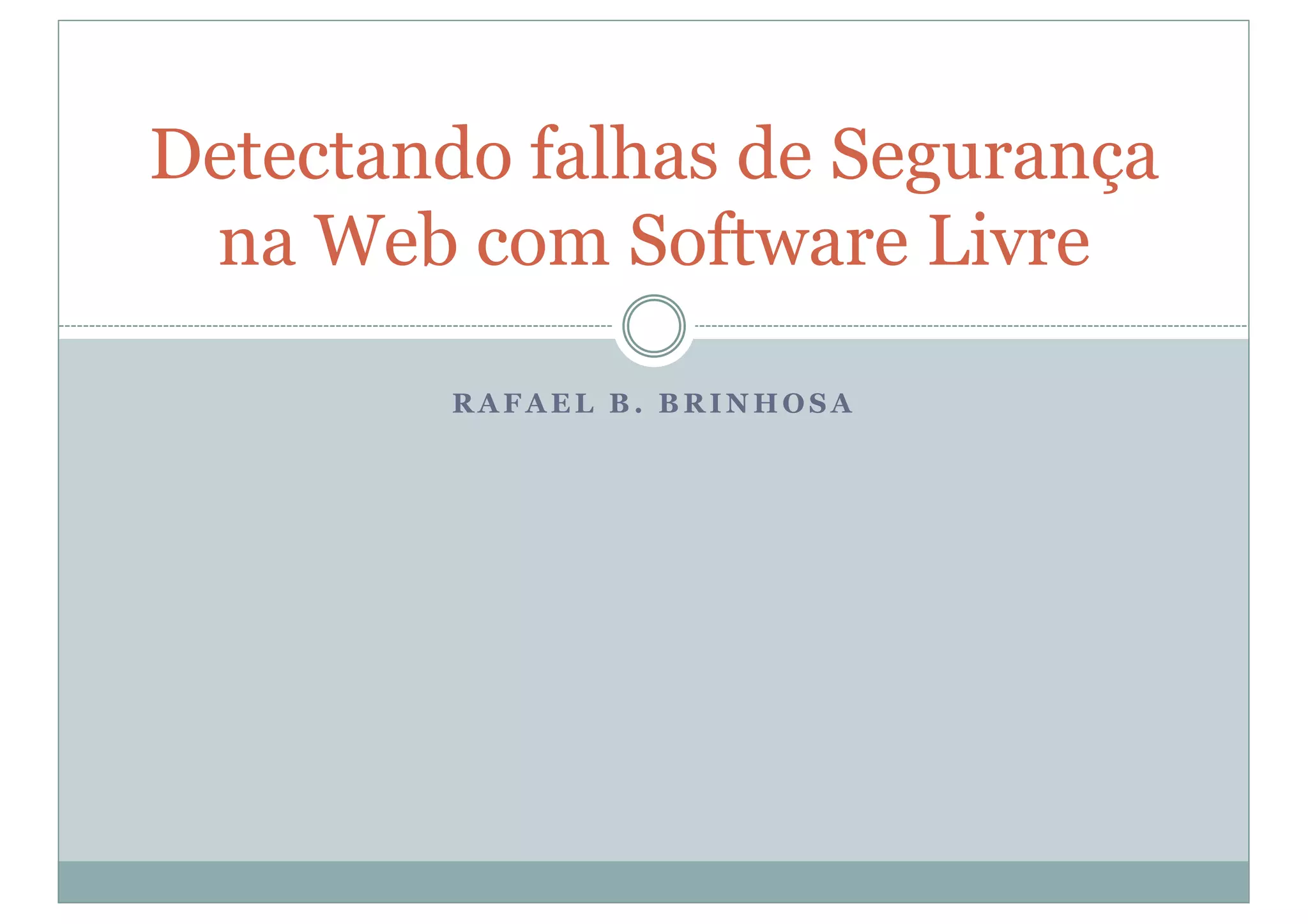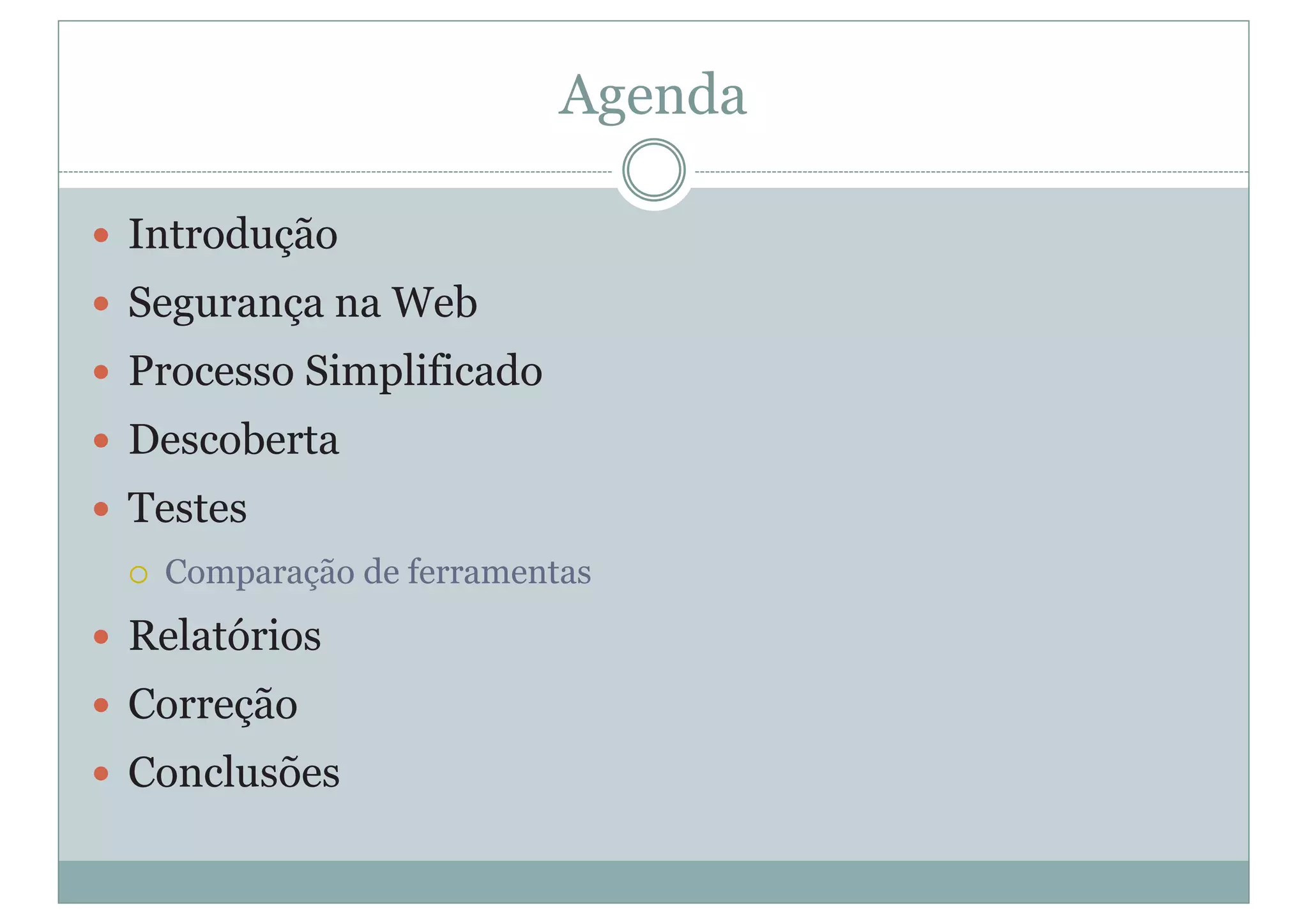 O documento discute a detecção de vulnerabilidades de segurança na web usando software livre. Ele descreve ferramentas como nmap, OWASP DirBuster e w3af que podem ser usadas para descobrir vulnerabilidades e testá-las através de abordagens de caixa-branca e caixa-preta. O documento também discute a importância de relatórios e métricas de segurança e o processo de correção de vulnerabilidades encontradas.