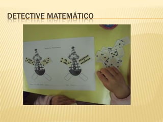 O documento descreve uma atividade chamada "Detective Matemático" que usa dominós para descobrir números. A atividade envolve resolver mistérios matemáticos usando peças de dominó. A atividade é repetida várias vezes no documento.