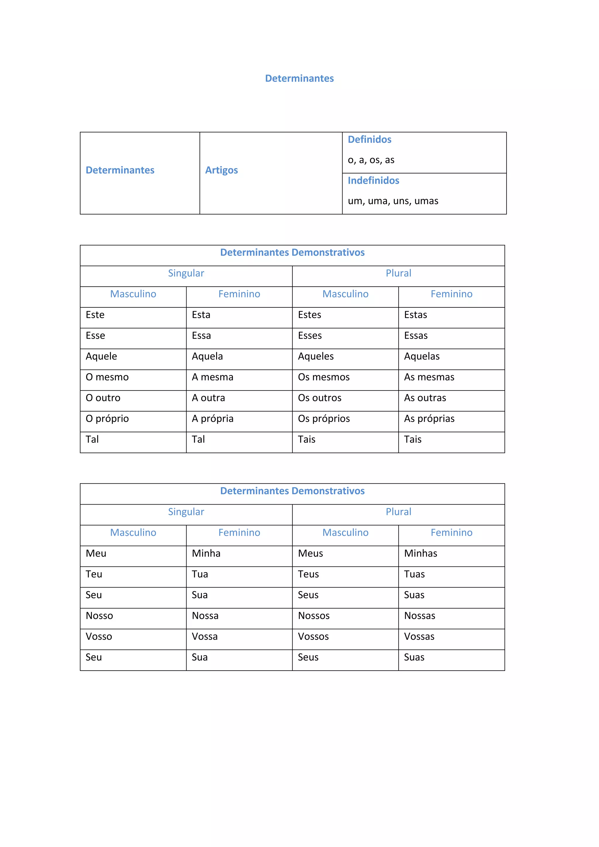 O documento lista e define os principais tipos de determinantes em português: 1) artigos definidos e indefinidos; 2) determinantes demonstrativos, listando os masculinos e femininos no singular e plural; 3) possessivos no singular e plural. Também apresenta os diferentes graus de adjetivos: normal, comparativo, superlativo absoluto e relativo.