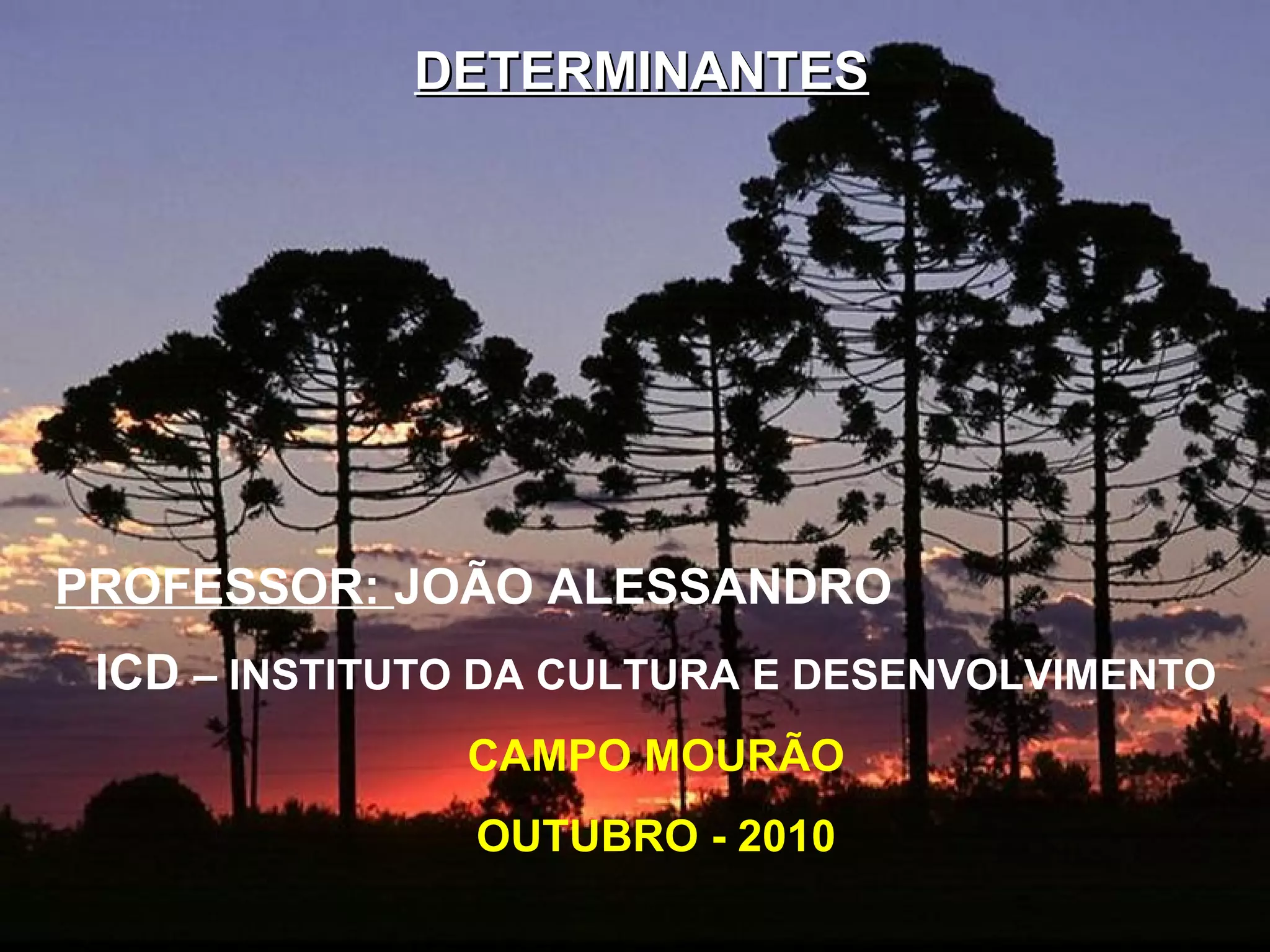 O documento discute os determinantes de matrizes quadradas. Explica que um determinante é um número real associado a uma matriz quadrada e fornece a notação. Em seguida, resume os métodos para calcular determinantes de matrizes de 1a, 2a e 3a ordem, incluindo a regra de Sarrus para matrizes de 3a ordem.