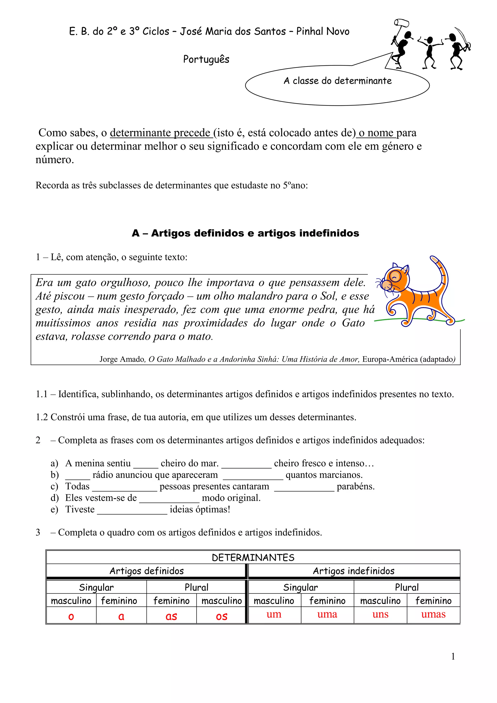 Este documento apresenta as subclasses de determinantes da língua portuguesa: artigos, possessivos, demonstrativos, indefinidos, numerais, interrogativos e relativos. Fornece exemplos de cada classe e exercícios para identificar e utilizar corretamente cada tipo de determinante.