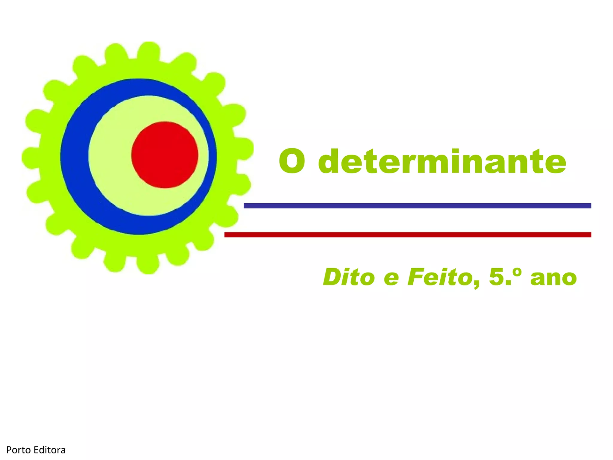Este documento fornece uma explicação sobre os diferentes tipos de determinantes em português, incluindo artigos, demonstrativos e possessivos. Ele explica que os determinantes concordam em gênero e número com os nomes ou grupos nominais que acompanham e fornece exemplos dos diferentes determinantes para singular e plural, masculino e feminino.
