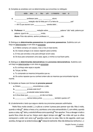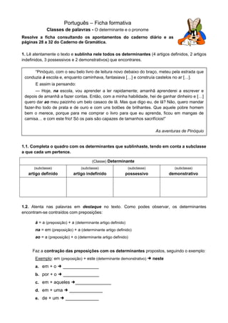 Este documento fornece instruções para preencher uma ficha sobre determinantes e pronomes em português. Inclui exercícios para identificar e distinguir diferentes tipos de determinantes e pronomes, como artigos, possessivos, demonstrativos e pessoais em textos. Também pede para completar frases e quadros com esses elementos gramaticais.