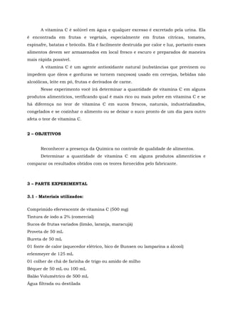Este documento descreve um experimento para determinar a quantidade de vitamina C em alimentos através de uma titulação com iodo. A vitamina C é importante para a saúde e é encontrada principalmente em frutas e vegetais. A titulação com iodo permite quantificar a vitamina C nos alimentos e comparar os resultados com as informações nutricionais do rótulo.