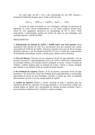 O documento descreve um procedimento para determinar a concentração de cloreto em amostras usando o método argentimétrico de Mohr. O cloreto é titulado com uma solução padrão de nitrato de prata usando cromato de potássio como indicador. O ponto final ocorre quando o primeiro excesso de íons prata forma o precipitado vermelho de cromato de prata. O procedimento é aplicado para analisar amostras de água e soro fisiológico.