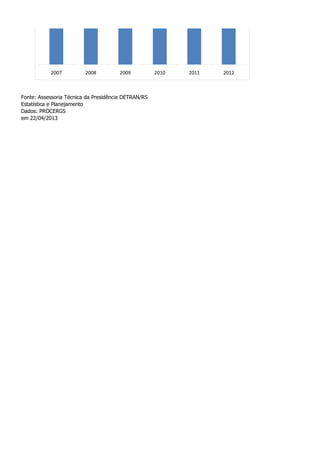De 2007 a 2013, o Rio Grande do Sul registrou 2.661 atropelamentos com vítimas fatais, representando 23,9% do total de 11.148 acidentes com mortes. A participação de atropelamentos com mortes no total de acidentes com mortes apresentou uma queda gradual ao longo dos anos, de 26,5% em 2007 para 21,7% em 2012. Os dados refletem uma análise realizada pelo Detran/RS até março de 2013.