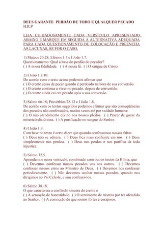 O documento discute como Deus garante o perdão de todos os pecados. Ele apresenta 10 perguntas e afirmações sobre a base bíblica para o perdão, como a confissão de pecados leva ao perdão, e as consequências de não confessar pecados.