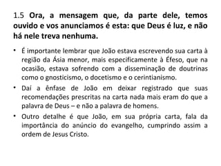Este documento discute a primeira epístola de João. João enfatiza que Deus é luz e não há trevas nele, contrariando as doutrinas gnósticas, docéticas e cerintianas da época. Viver na luz de Deus significa praticar os ensinamentos de Jesus e testemunhar a palavra de Deus, ao invés de viver em mentira longe da verdade.
