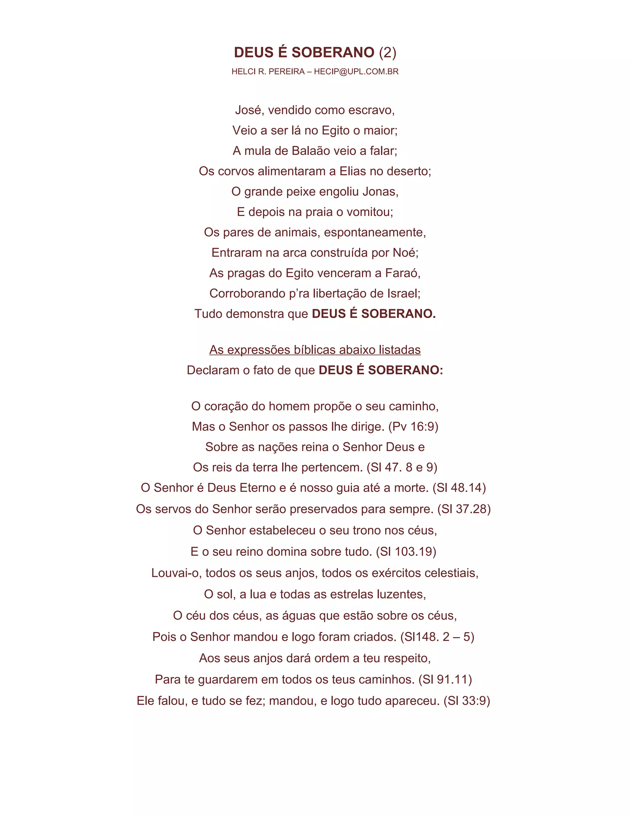 Deus é soberano sobre todas as coisas. Exemplos bíblicos mostram Sua soberania sobre a vida de José, Balaão e sua mula, Jonas e o grande peixe, Noé e a arca. Passagens da Bíblia declaram que Deus reina sobre as nações, guia os homens até a morte e estabeleceu Seu trono nos céus sobre todas as coisas.
