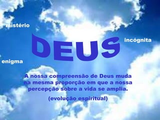 O documento discute diferentes concepções de Deus, incluindo se Deus é infinito, antropomórfico ou plural. Argumenta-se que atribuir a formação do universo ao acaso ou às propriedades da matéria não faz sentido e que deve haver uma causa inteligente por trás da criação. O Espiritismo vê Deus como distinto mas imanente à criação, não se confundindo com o panteísmo ou antropomorfismo.