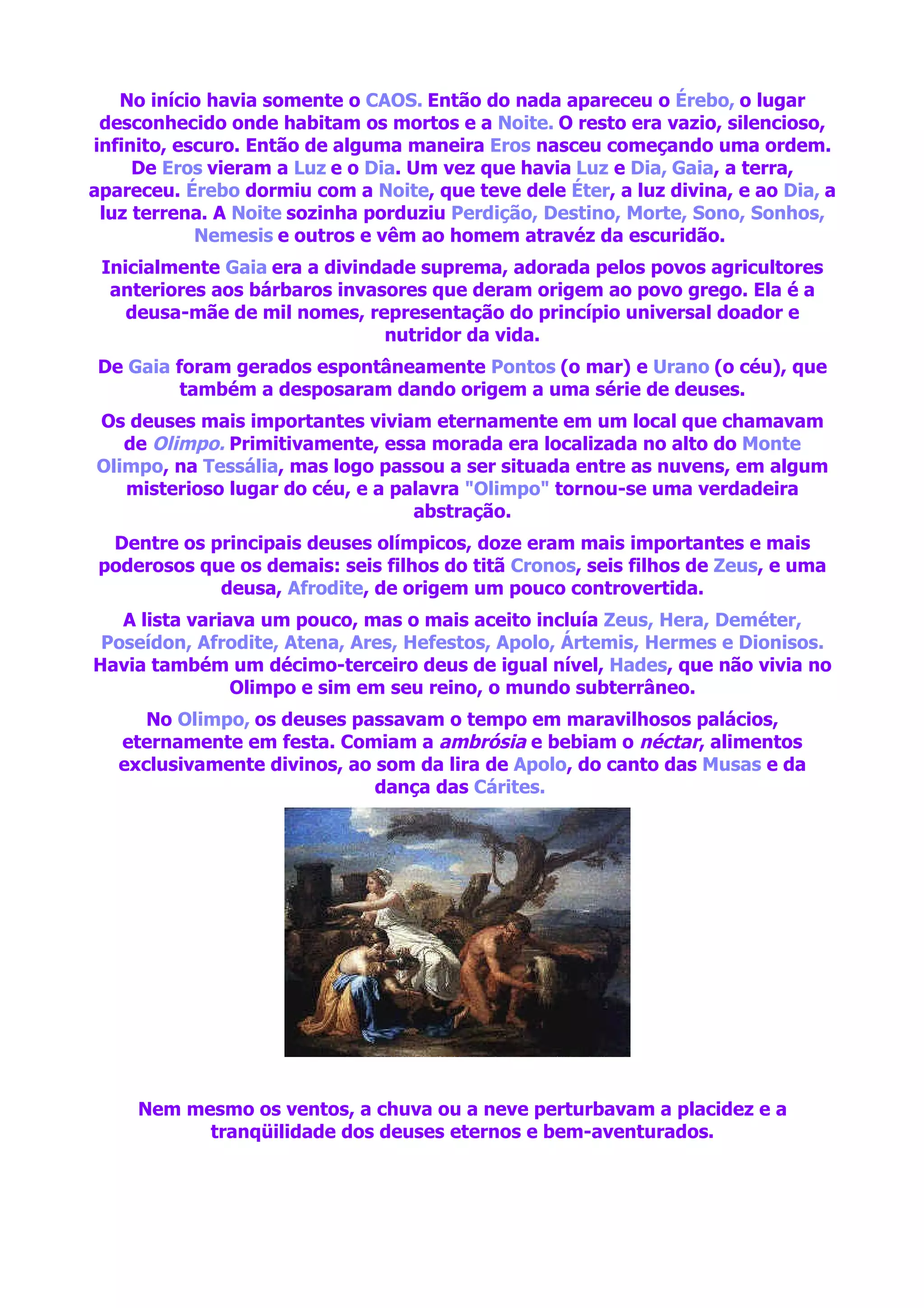 A mitologia grega descreve a criação do mundo a partir do caos inicial. Os primeiros deuses foram Gaia, a terra, Urano, o céu, e Pontos, o mar. Os deuses mais poderosos viviam no Monte Olimpo e incluíam Zeus, Poseidon, Hera, Deméter, Atena e Apolo. Eles governavam os fenômenos naturais e as vidas dos humanos, que dependiam completamente da vontade dos deuses.
