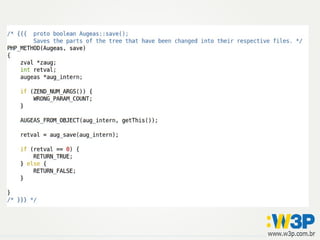 O documento fornece informações sobre o desenvolvimento de extensões PHP. Em 3 frases: