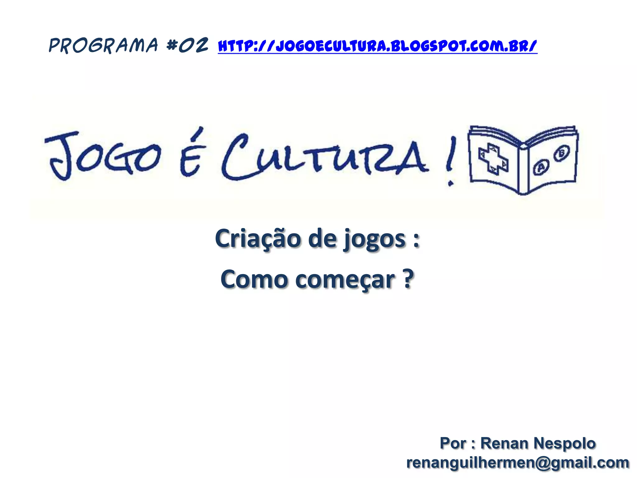 O documento fornece instruções sobre como começar a criar jogos, listando os requisitos mínimos como um computador, mouse e tempo. Ele também discute ferramentas úteis como editores de imagem, frameworks, modeladores 3D e engines que podem ser usados. Por fim, fornece referências adicionais sobre produção de jogos com tecnologias livres e proprietárias.