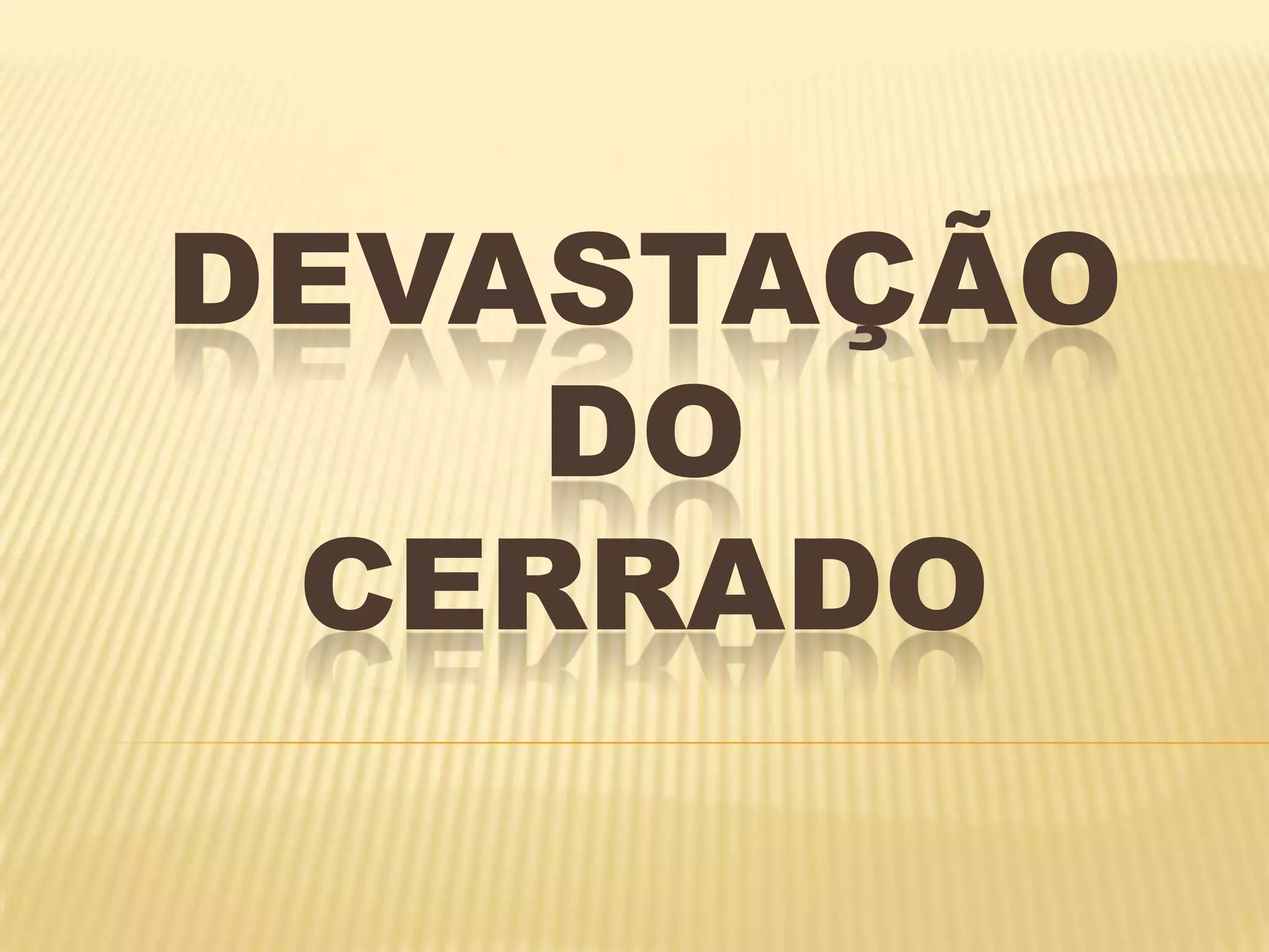 O documento descreve a devastação do Cerrado brasileiro, o segundo maior bioma do país. Originalmente o Cerrado se estendia por 2 milhões de km2, mas atualmente restam apenas 20% devido ao desmatamento. O bioma abriga grande biodiversidade com mais de 10 mil espécies vegetais e 837 de aves e 161 de mamíferos, porém vem sendo seriamente afetado pela caça, extração ilegal de animais, garimpo e desmatamento para pecuária e agricultura.