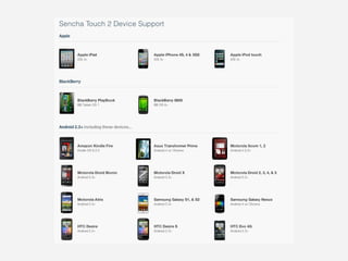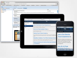 O documento discute o desenvolvimento de aplicações ricas para a web e dispositivos móveis usando as bibliotecas Ext JS 4 e Sencha Touch 2. Apresenta os frameworks, princípios de organização de código como MVC, e exemplos de aplicações criadas com essas tecnologias. Também aborda tópicos como testes, integração com dispositivos móveis e cursos gratuitos online sobre os assuntos.