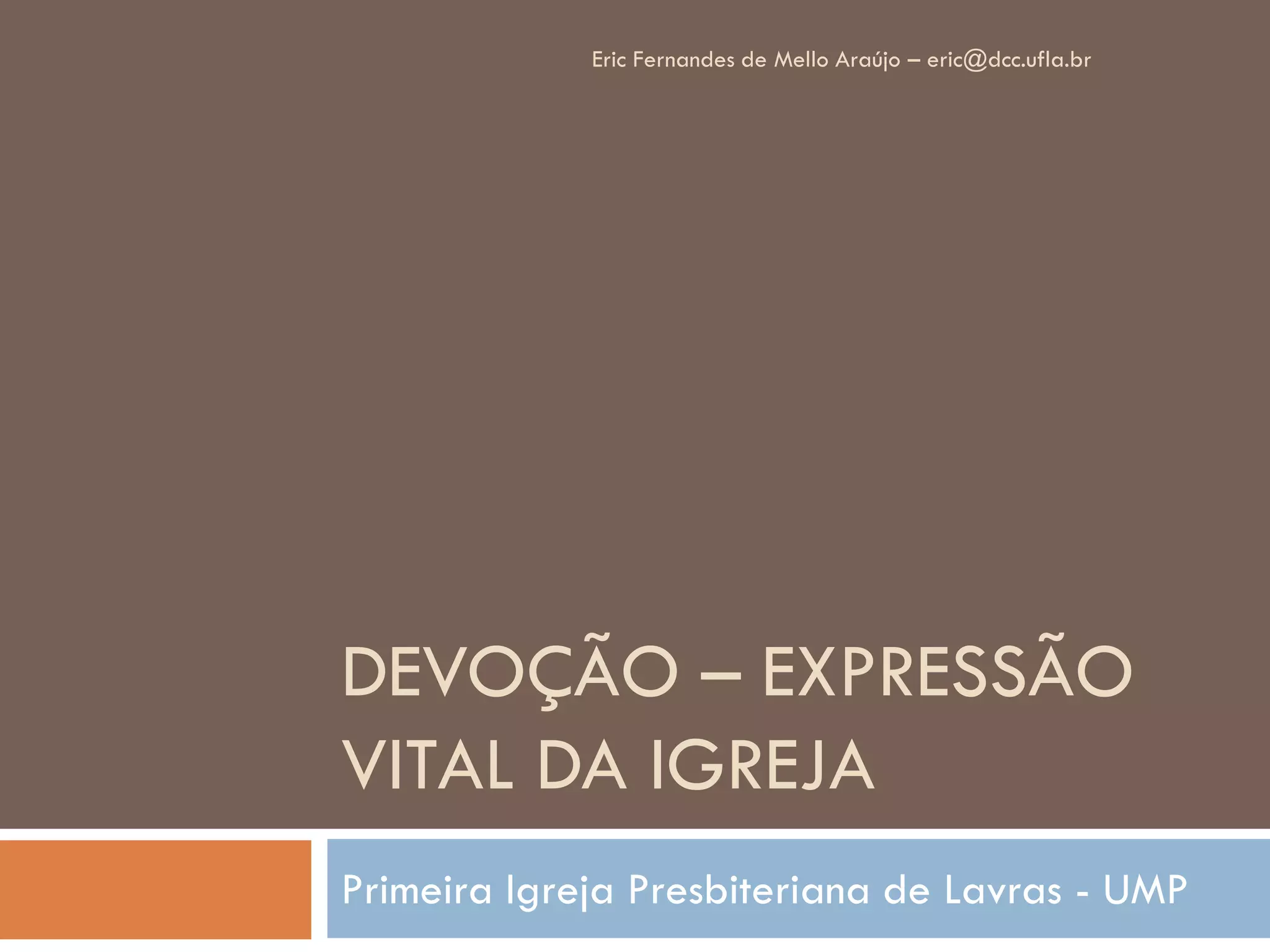 O documento discute a devoção como uma expressão vital da igreja. Ele define devoção como piedade e dedicação a Deus, e explora exemplos bíblicos como Daniel, Davi e a igreja primitiva. O documento também discute práticas devocionais como oração, intercessão, meditação e leitura bíblica.
