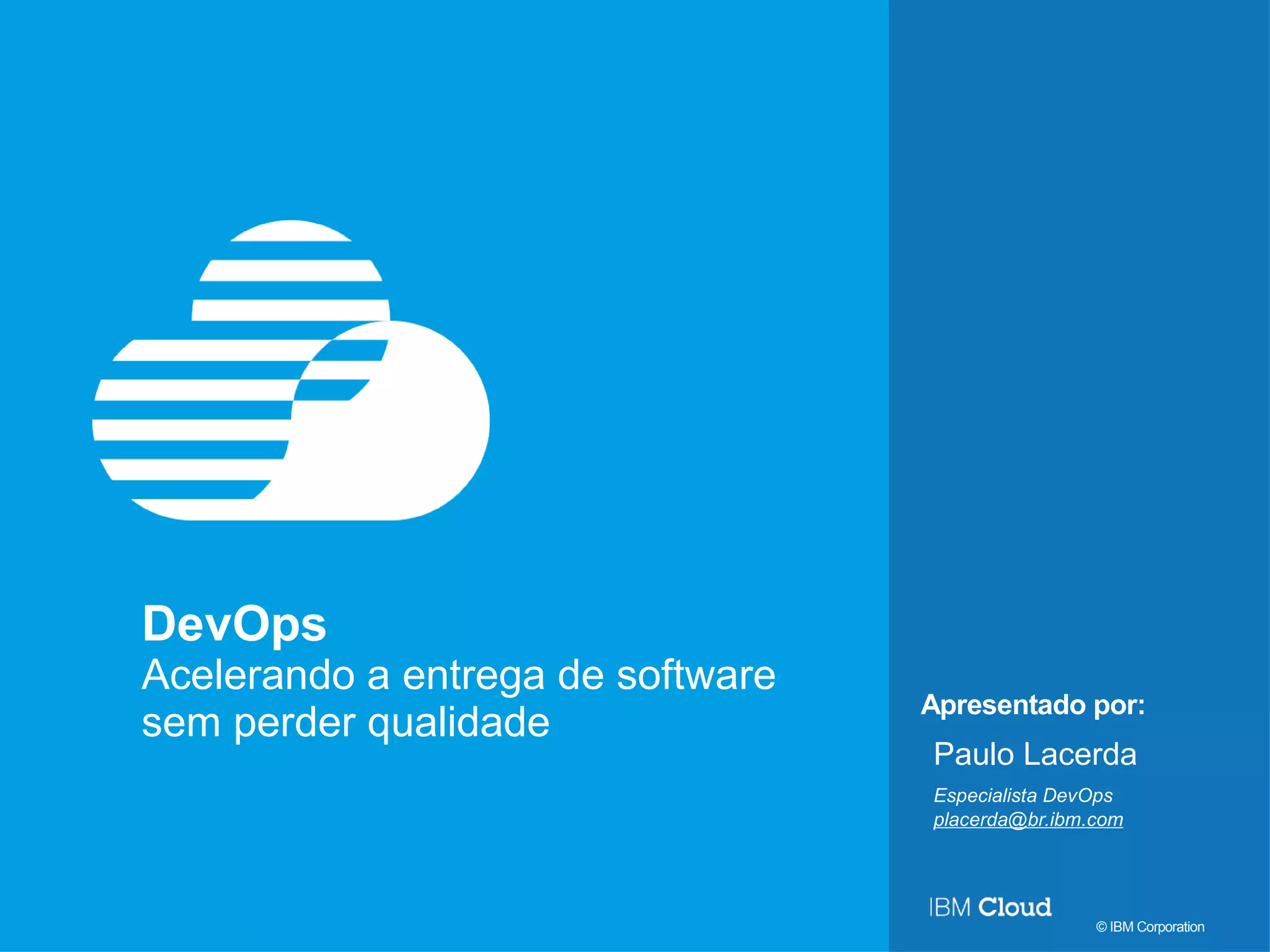 O documento apresenta os conceitos e desafios da entrega de software, a visão da IBM para DevOps e como a computação em nuvem e a entrega contínua podem ajudar a superar esses desafios. A agenda inclui tópicos como desafios da entrega de software, DevOps, computação em nuvem, desenvolvimento para nuvem e entrega contínua na nuvem.