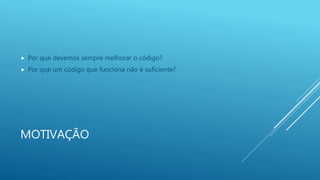 O documento aborda princípios para melhorar a qualidade do código, destacando temas como singleton, acoplamento rígido, testabilidade e otimização prematura. Ele apresenta os princípios SOLID, incluindo a responsabilidade única, abertura/fechamento, substituição de Liskov, segregação de interfaces e inversão de dependência, fornecendo exemplos práticos de cada um. A ênfase está na necessidade de manter o código simples, bem estruturado e testável para facilitar sua manutenção e evolução.