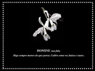 O documento fornece dez mandamentos sobre como ter uma vida positiva e construtiva, incluindo falar pouco e suavemente, pensar antes de prometer algo, elogiar os outros, ter interesse nos outros, ser alegre, manter a mente aberta, evitar fofocas, ter cuidado com os sentimentos alheios e não ser excessivamente zeloso dos próprios direitos.