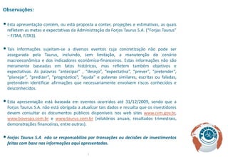 Este documento fornece um resumo da história de 70 anos da Forjas Taurus S.A., incluindo suas aquisições e expansão para novas linhas de negócios. O documento também descreve a estrutura societária da empresa, sua estrutura organizacional, estratégias de crescimento e inovação, análise SWOT e detalhes sobre seus principais segmentos de negócios.